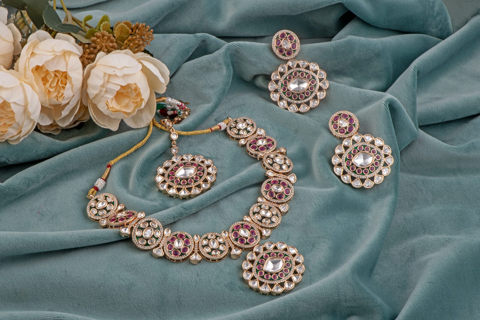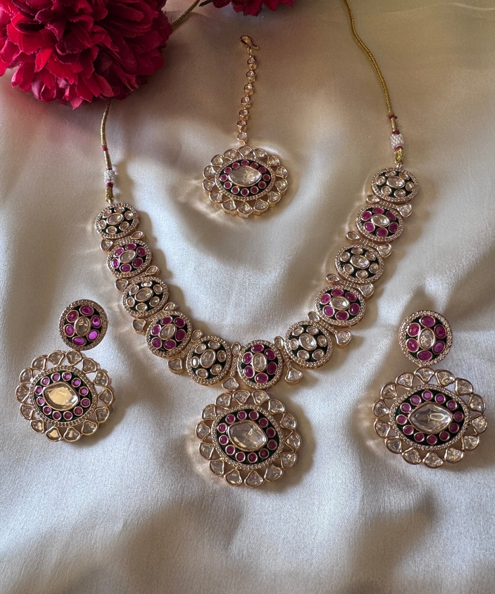 24 carat gold polish kundan with meenakari necklace with teeka from Zevy is a finely crafted necklace that blends traditional aesthetics with modern wearability. Made using premium materials and meticulous workmanship, this piece adds instant elegance to sarees, lehengas, and Indo-western outfits. The design highlights include intricately set stones, secure clasps, and a comfortable weight profile so you can wear it through celebrations.