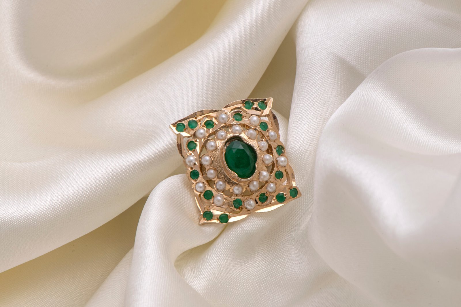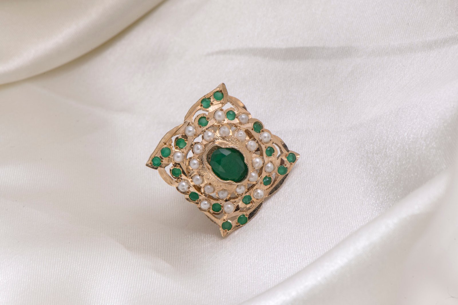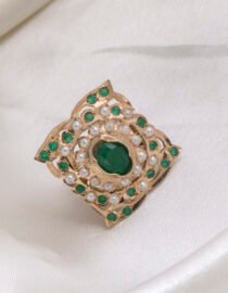 Short Description: A regal statement of tradition and grace, this vintage-inspired ring features a rich emerald-green center surrounded by a delicate halo of pearls. Its unique diamond-shaped silhouette offers a timeless, royal aesthetic.