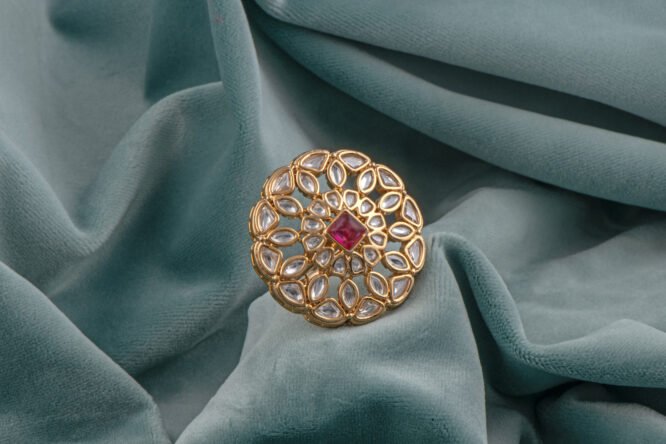 Craftsmanship & Design: This ring is crafted with a high-luster gold-toned finish, showcasing an intricate openwork circular frame. A square-cut ruby-hued stone sits at the core, surrounded by two layers of handset petal-shaped kundan crystals that create a brilliant, floral-inspired texture.