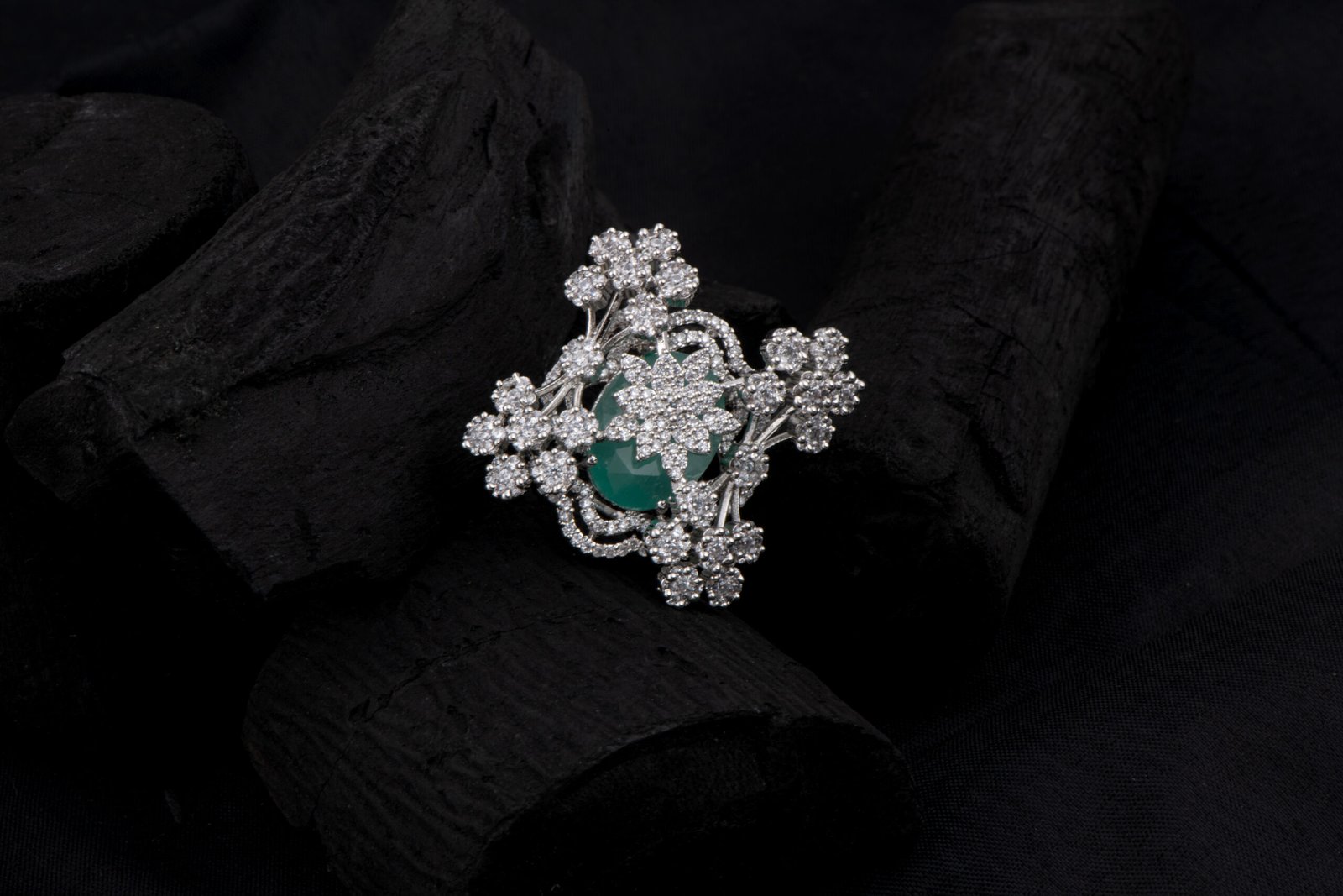 Craftsmanship & Design: This ring is expertly crafted with a premium silver-toned finish. A central, oval-cut green stone is partially veiled by a handcrafted lattice of shimmering micro-zircons. The design extends into four delicate floral clusters, creating a unique, multi-dimensional silhouette that sits beautifully across the finger.