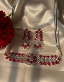 Handcrafted American Diamond with Ruby Choker Set by Zevy — American Diamond with Ruby Choker Set. This elegant piece is finished with premium plating and designed to elevate both bridal and festive looks. Lightweight and comfortable for long wear, it pairs beautifully with sarees, lehengas, and modern fusion outfits. Perfect as a gift or a signature addition to your jewellery collection. Exquisite craftsmanship and timeless design make this necklace a lasting keepsake. Exquisite craftsmanship and timeless design m