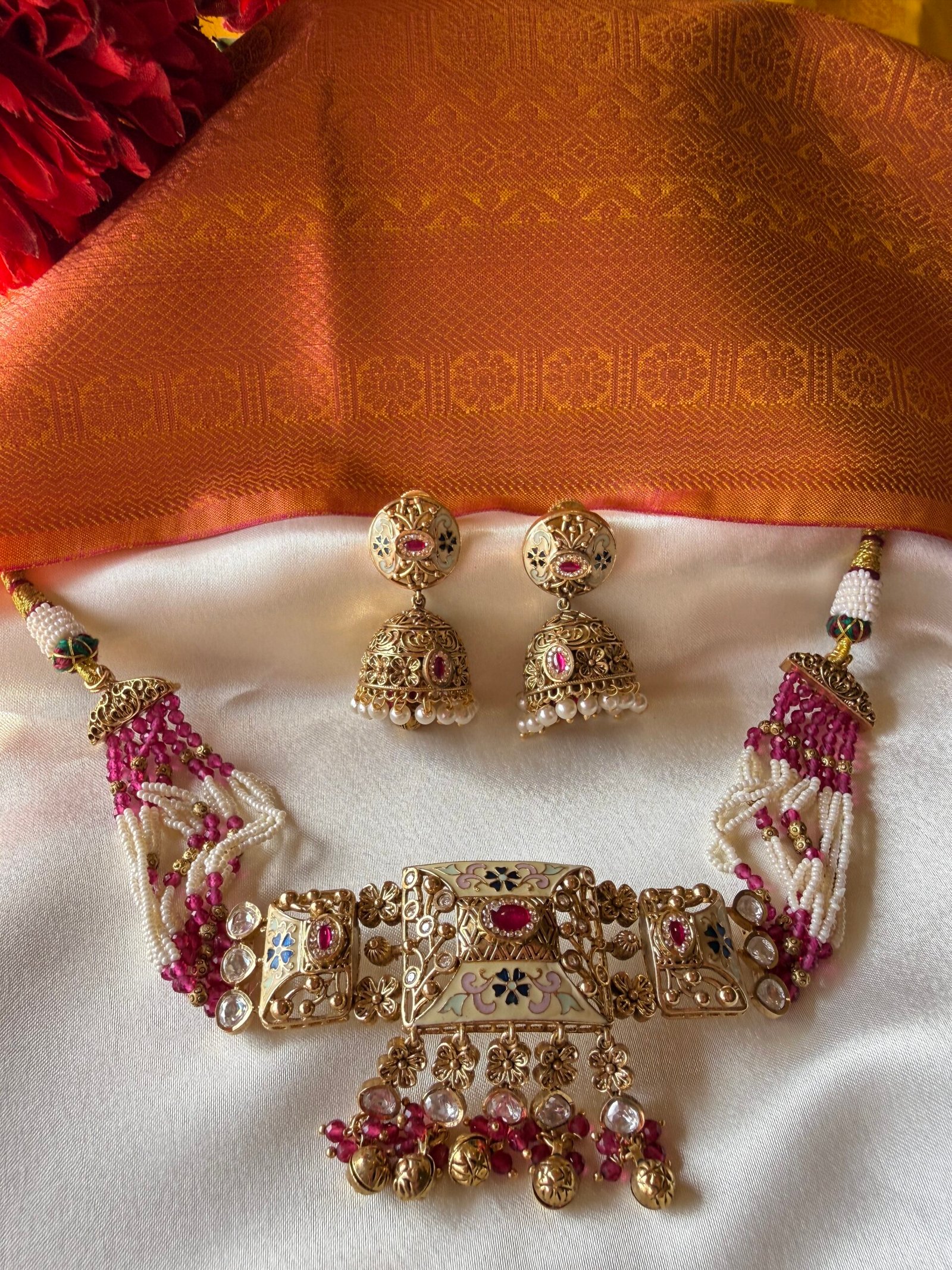 Styling: Style this necklace with classic bridal wear—sarees and lehengas—for weddings and festive celebrations, or pair it with Indo-western outfits for a contemporary fusion statement. For sets that include matching earrings, coordinate the earrings with hair and makeup for a cohesive bridal look. This piece also works beautifully as the focal point when layered with delicate chains for a modern aesthetic.
