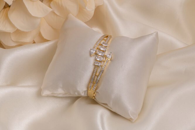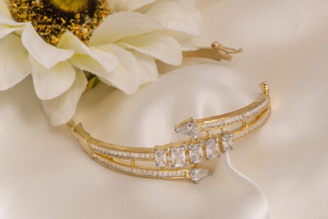 Styling: This versatile gold plated bracelet is designed to be the crowning jewel of your accessory collection. It pairs exceptionally well with heavy ethnic ensembles like silk sarees and bridal lehengas, or serves as a sharp, glamorous accent to a contemporary minimalist gown. The warm gold tones and brilliant white crystals offer a timeless aesthetic, making it an ideal standalone signature piece that exudes royal charm and sophisticated grace.