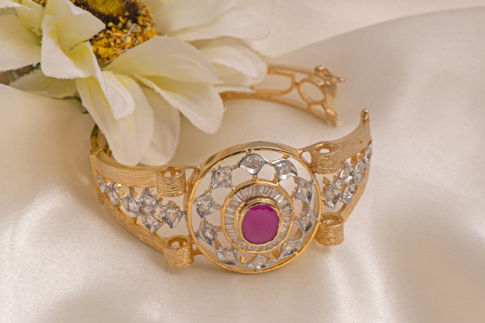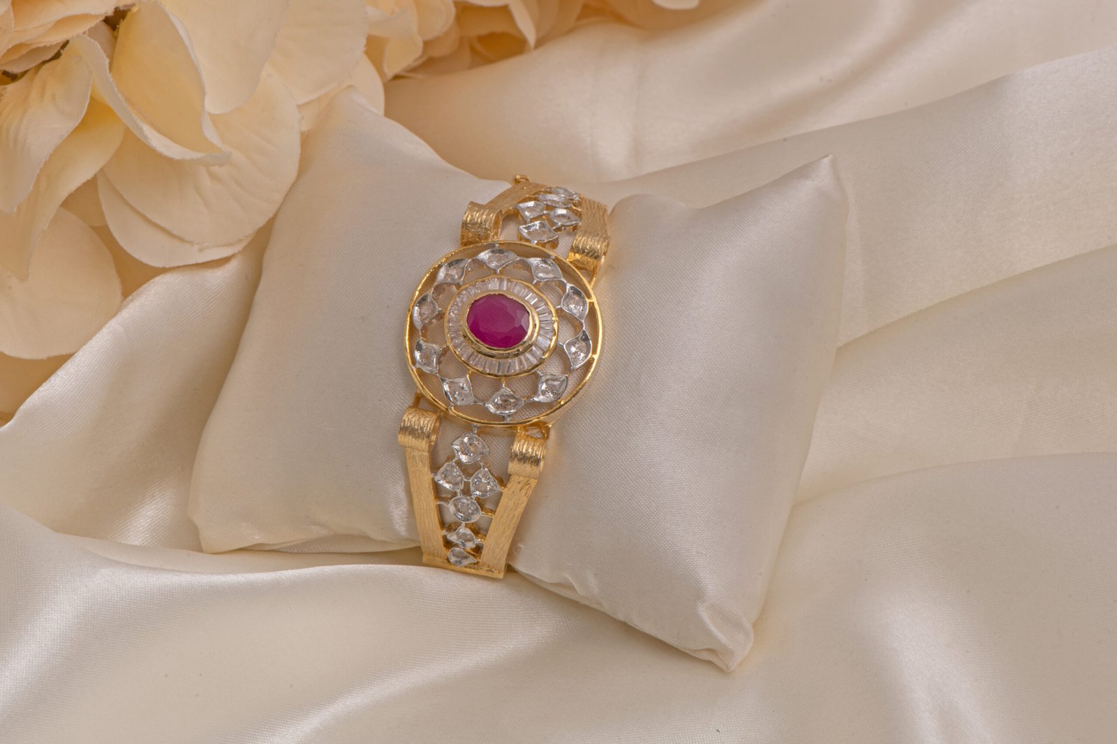 Short Description: The Gold Polished Bracelet is a regal statement of heritage-inspired luxury and artistic brilliance. Featuring a vibrant, central oval ruby stone surrounded by a sunburst of Cubic Zirconia (American Diamonds), this handcrafted gold polished bracelet is the ultimate choice for bridal festivities and grand celebrations.