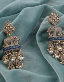 Gold Plated Kundan & AD Blue Stone Elephant Design Earrings (Sold Out) — Handcrafted by Zevy’s artisans, this pair celebrates traditional techniques with a contemporary finish. Gold plated kundan and AD blue stone earrings in an elephant design; a statement ethnic motif. (Sold Out)