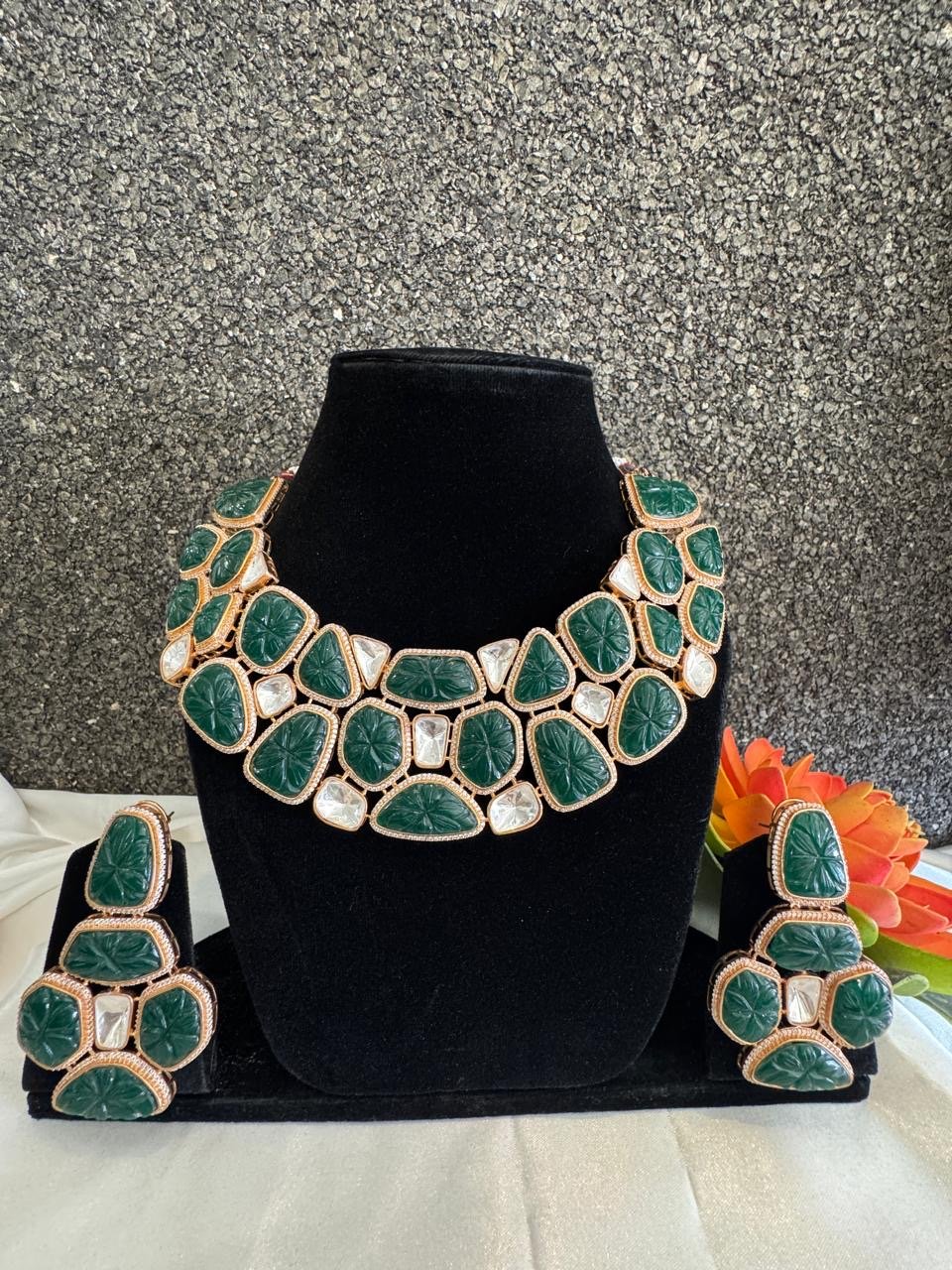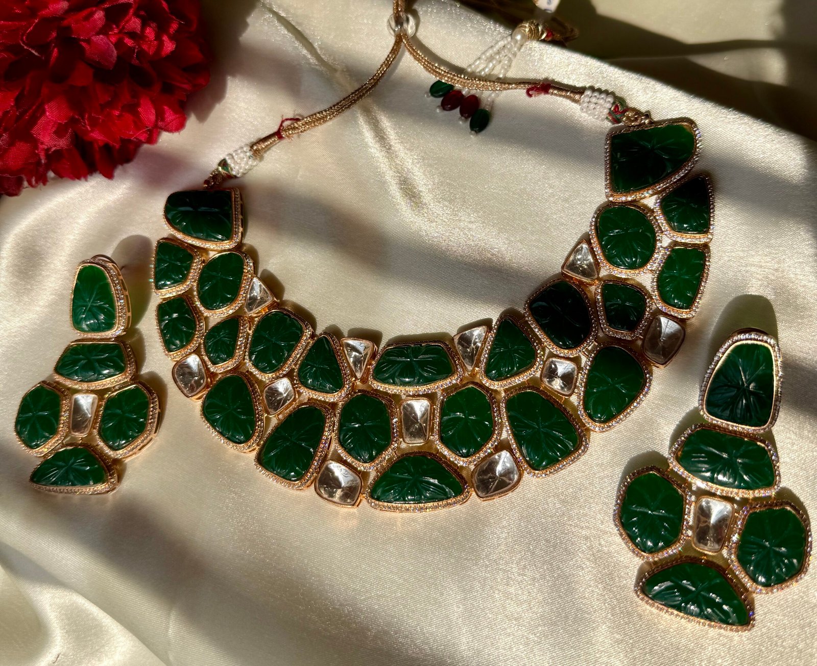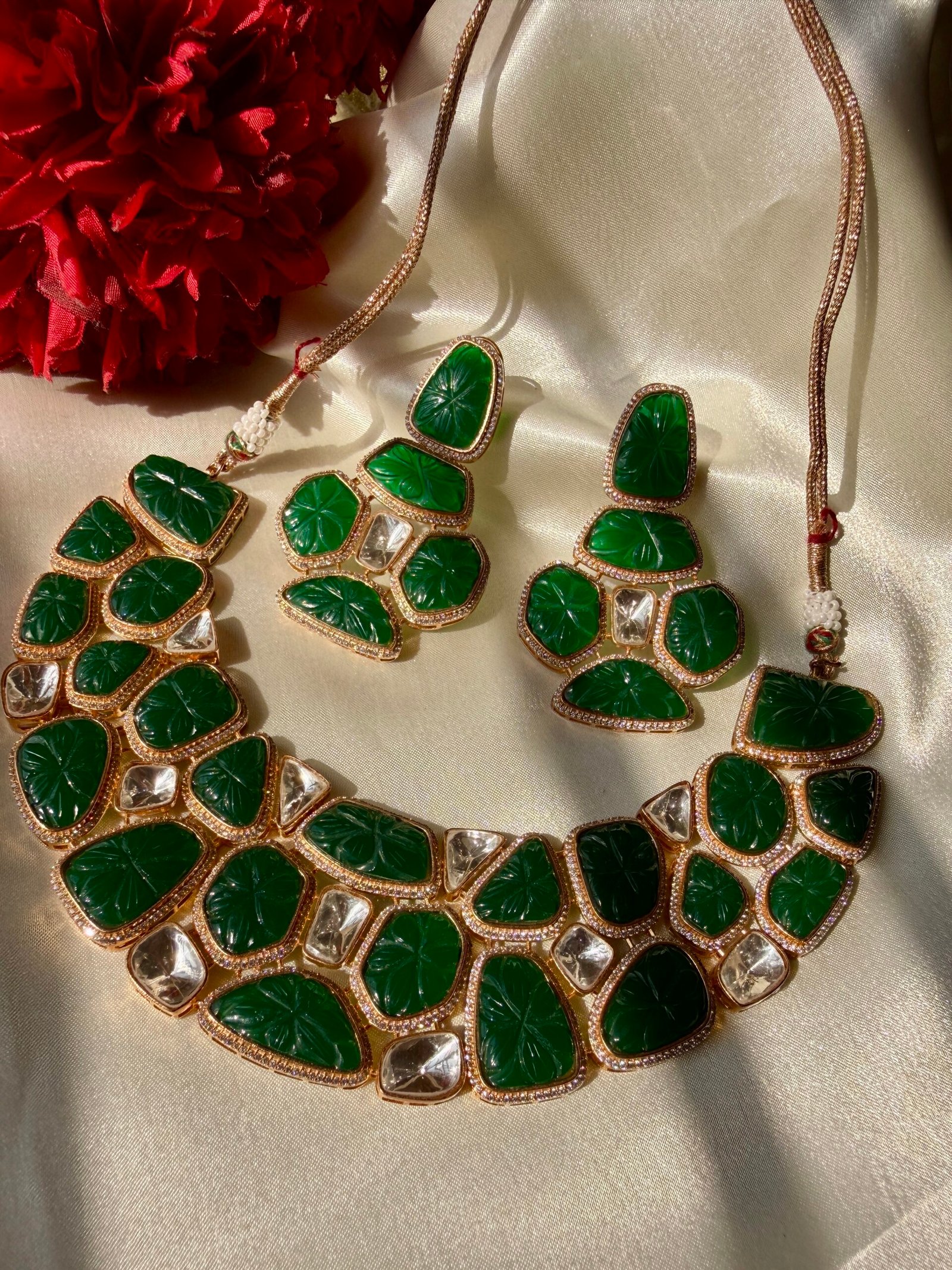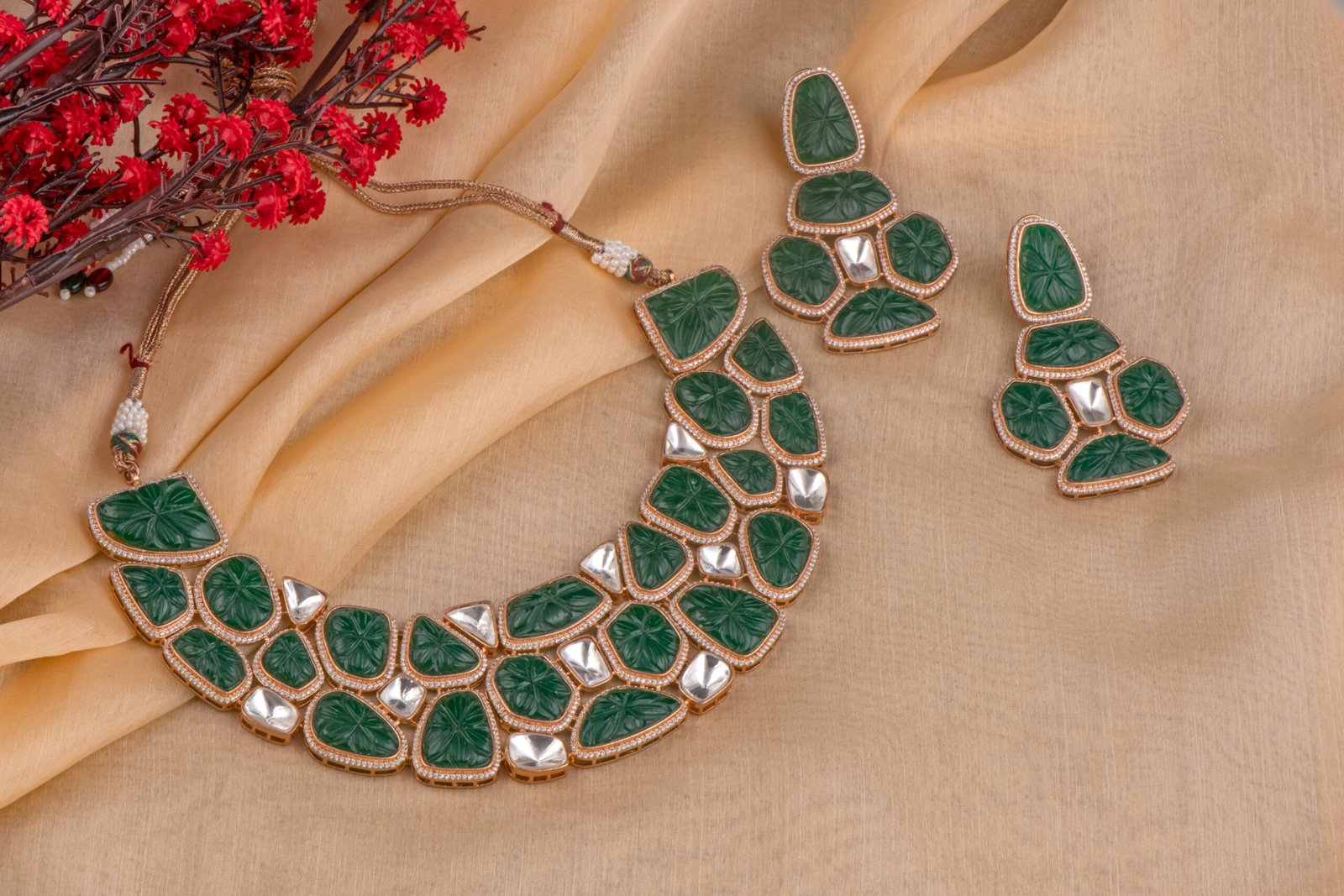 Gold Plated Kundan Necklace Set: Emerald Green Polki Bridal Jewelry from Zevy is a finely crafted necklace that blends traditional aesthetics with modern wearability. Made using premium materials and meticulous workmanship, this piece adds instant elegance to sarees, lehengas, and Indo-western outfits. The design highlights include intricately set stones, secure clasps, and a comfortable weight profile so you can wear it through celebrations.