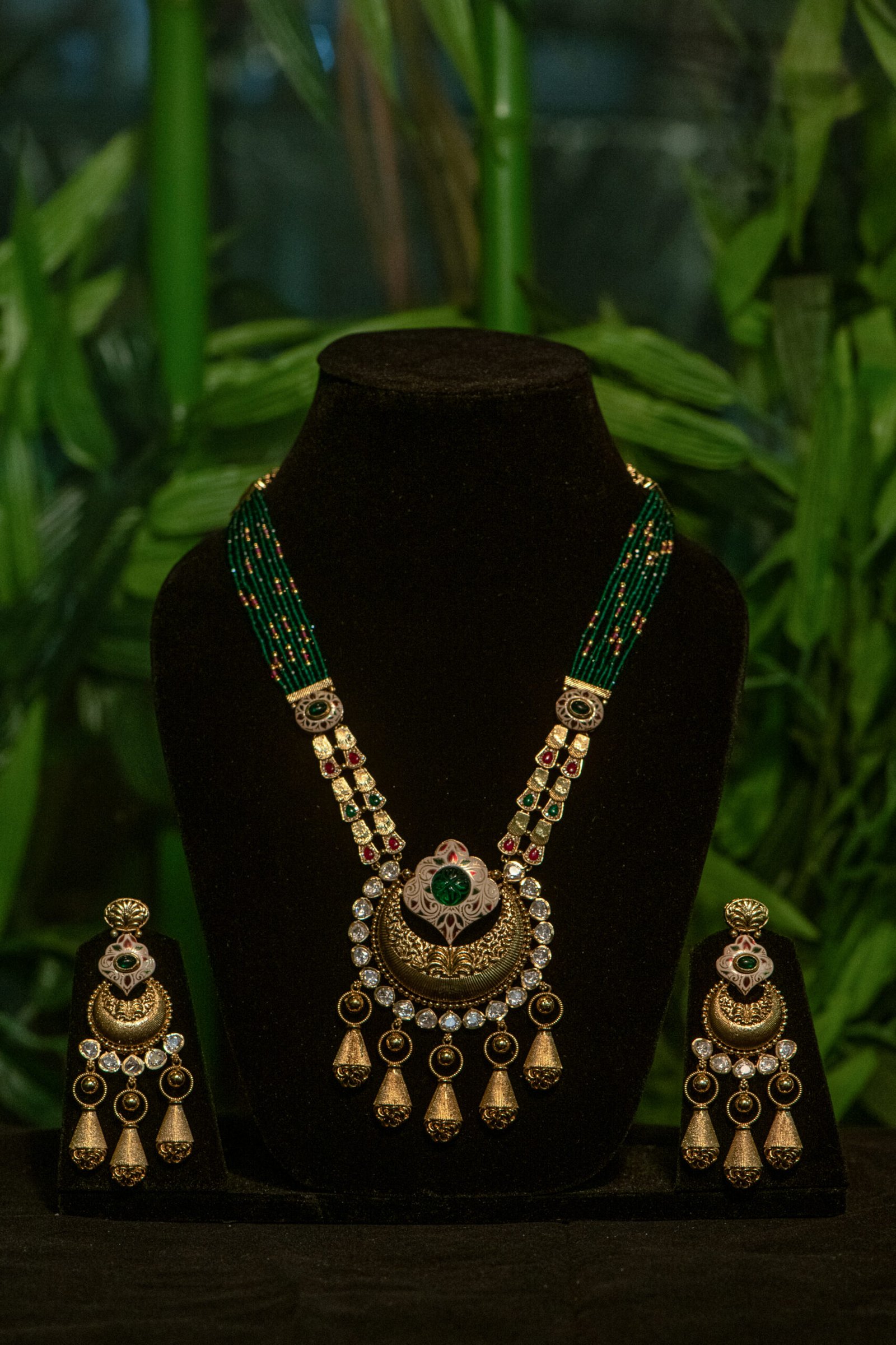 Gold plated kundan with green crystal beads long necklace from Zevy is a finely crafted necklace that blends traditional aesthetics with modern wearability. Made using premium materials and meticulous workmanship, this piece adds instant elegance to sarees, lehengas, and Indo-western outfits. The design highlights include intricately set stones, secure clasps, and a comfortable weight profile so you can wear it through celebrations.