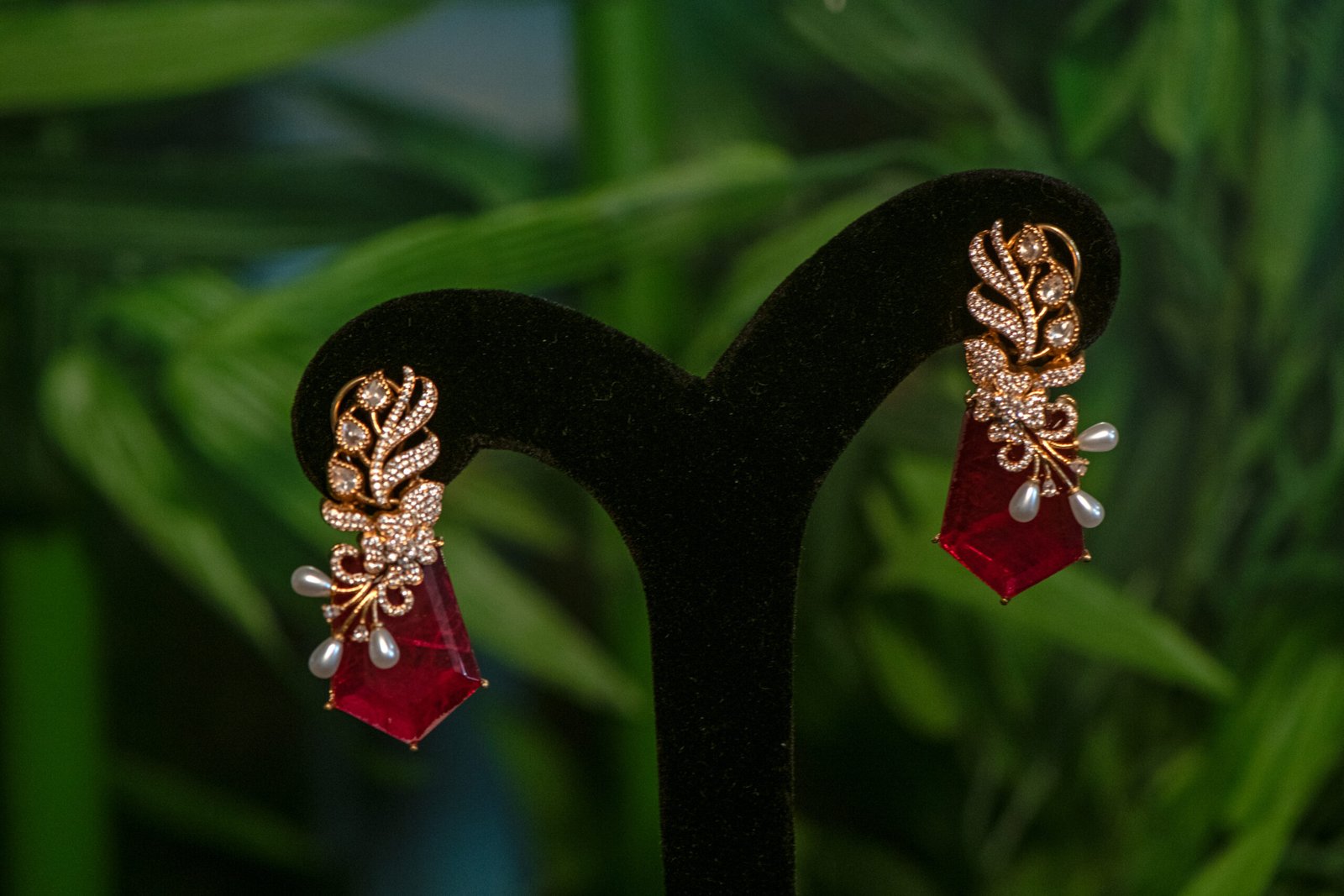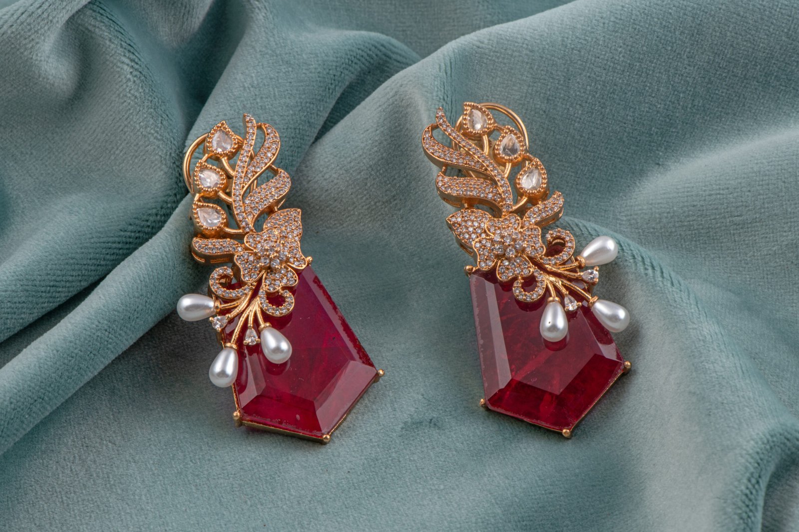 Gold Plated Red Stone & Pearl Drop Earrings — Handcrafted by Zevy’s artisans, this pair celebrates traditional techniques with a contemporary finish. Gold-plated earrings featuring red stones and pearls. Drop earring with a detailed, leaf-like motif at the top, embellished with smaller white stones and a large faceted red stone with pearl drops.