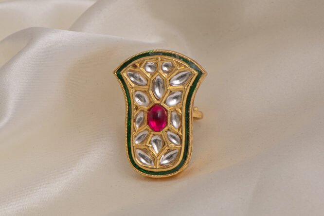 A distinctive Kundan statement ring featuring a unique arched silhouette adorned with clear stones and a vibrant ruby-red center. Framed by a rich green enamel border, this piece captures a classic regal color palette that exudes timeless elegance.
