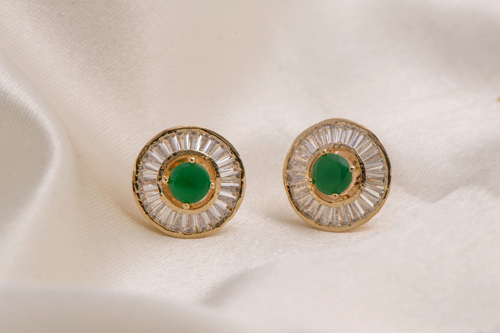 Craftsmanship & Materials: Meticulously made from a high-quality brass-based alloy, these studs are finished with a rich, tarnish-resistant gold polish. The design features a central round-cut emerald-green stone surrounded by a shimmering sunburst of tapered baguette American Diamonds. Each crystal is securely handcrafted to ensure maximum light reflection and a durable, luxury finish that stands the test of time.
