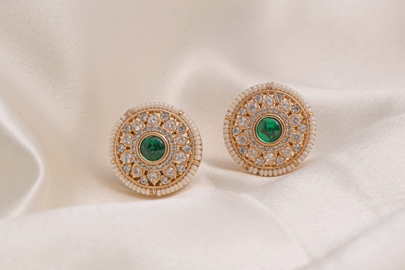 Craftsmanship & Materials: Meticulously made from a high-quality brass-based alloy, these studs are finished with a rich, tarnish-resistant gold polish. The design showcases a brilliant emerald-green central stone surrounded by intricate floral metalwork and shimmering micro-crystals. Each piece is framed by a pristine border of handset seed pearls, ensuring a durable and luxury handcrafted finish.