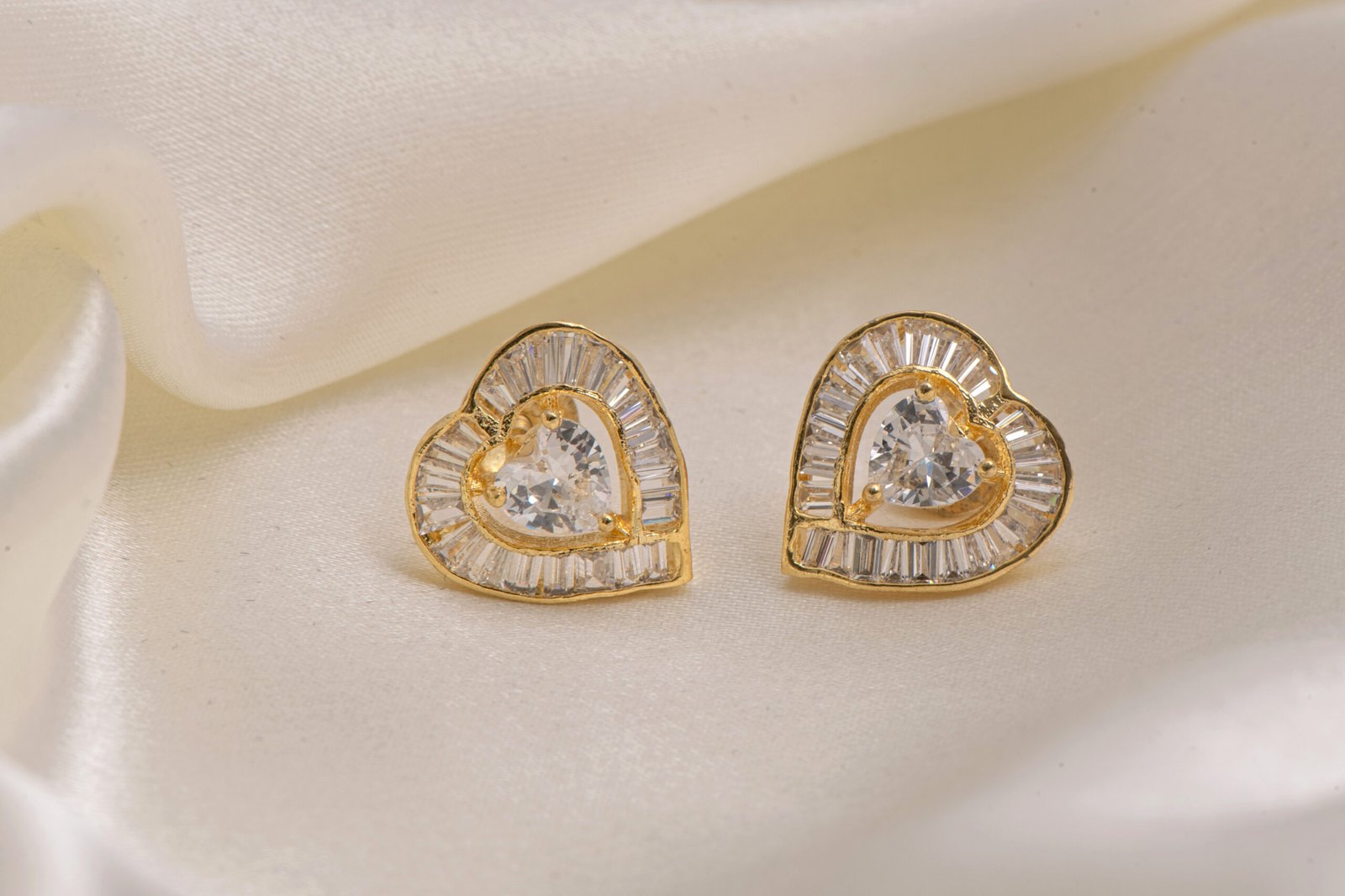 Short Description: Buy these Heart-Shaped Gold Polished Studs, a brilliant fusion of romantic design and luxury American Diamond craftsmanship. These stunning gold polished earrings feature high-grade crystals in a classic heart silhouette, perfect for bridal gifts. This premium accessory offers a radiant glow that elevates any ensemble with timeless charm.