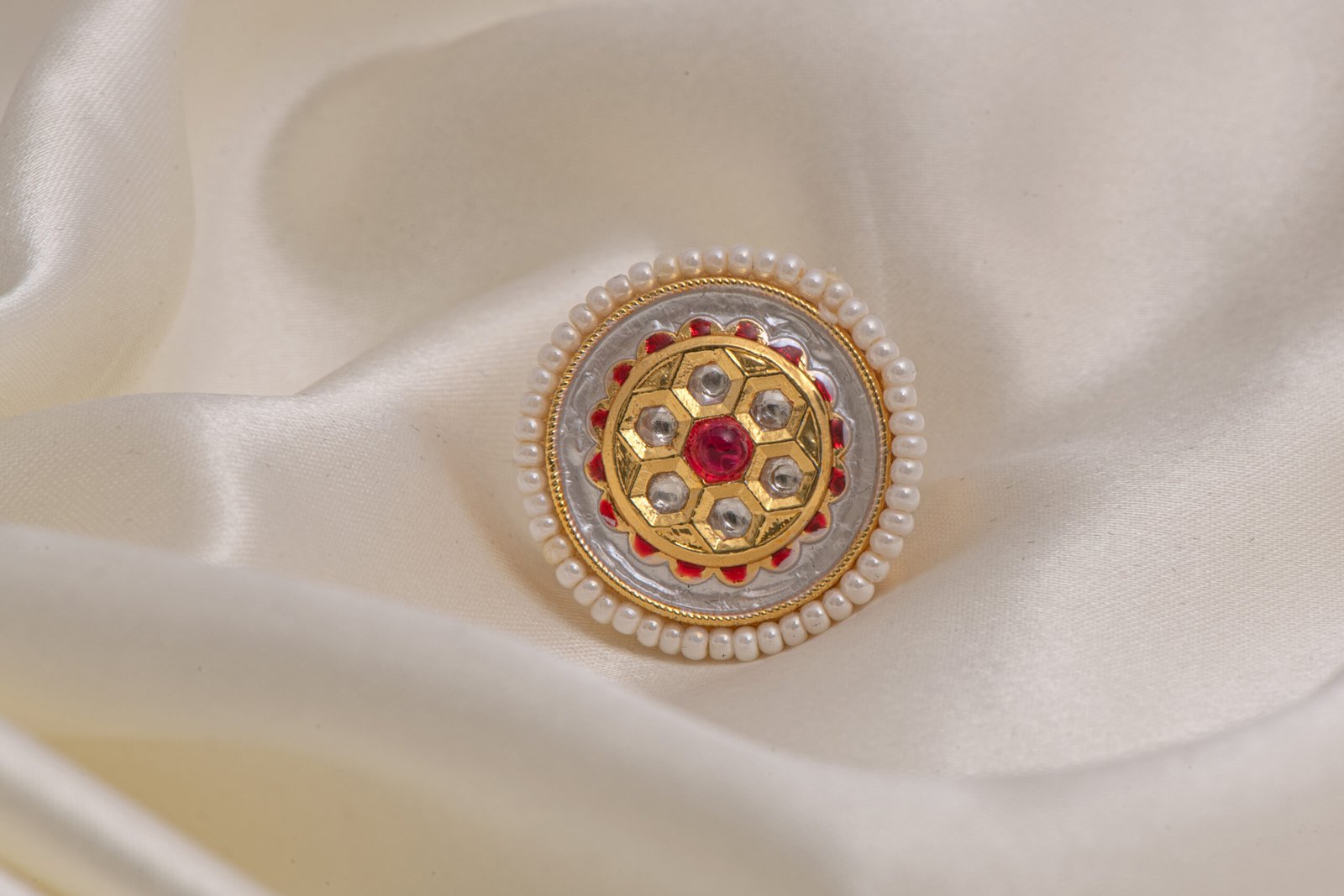 Craftsmanship & Materials: Meticulously made from a high-quality brass-based alloy, this ring is finished with a luxury, tarnish-resistant gold polish. The design features a central ruby-red stone set within a golden hexagon, surrounded by a white-enameled disc and a border of handset seed pearls. Each layer is precision-crafted to ensure a durable and luxury handcrafted finish that stands out for its architectural detail.