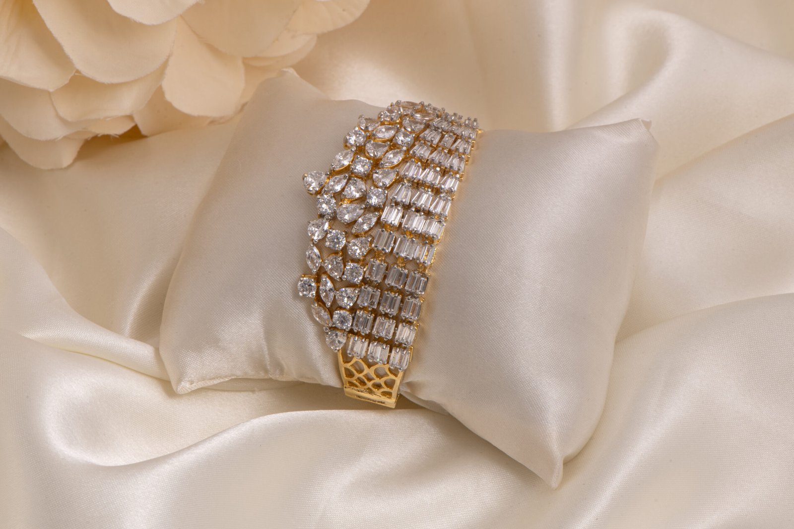 Short Description: The Imperial Tiara Gold Polished Bracelet is a crowning achievement in luxury jewelry, designed to radiate majesty and grandeur. Adorned with a dense tapestry of high-grade Cubic Zirconia (American Diamonds), this handcrafted gold polished bracelet is the ultimate statement piece for brides and red-carpet events.