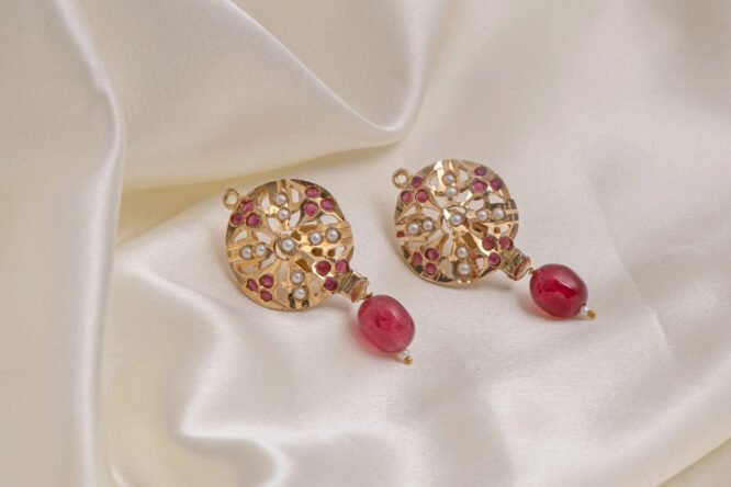 Craftsmanship & Materials: Meticulously made from a high-quality brass-based alloy, these earrings are finished with a rich, tarnish-resistant gold polish. The circular focal point showcases authentic Jadau work with meticulously handset Navratan stones and delicate white pearls. Each earring is finished with a bold, polished ruby-red bead drop, securely attached to the intricate floral metalwork.