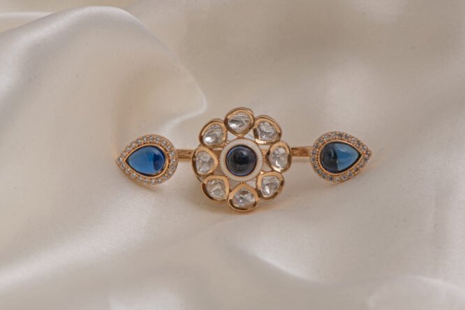 Styling: Style this gold polished double finger ring with ivory silk sarees, heavy bridal lehengas, or sophisticated designer cocktail gowns for a royal look. The neutral champagne tones against the brilliant white crystals and gold base make this handcrafted ring incredibly versatile for any festive palette. Its oversized, horizontal silhouette provides a powerful standalone statement that covers two fingers, perfect for a high-fashion impression.