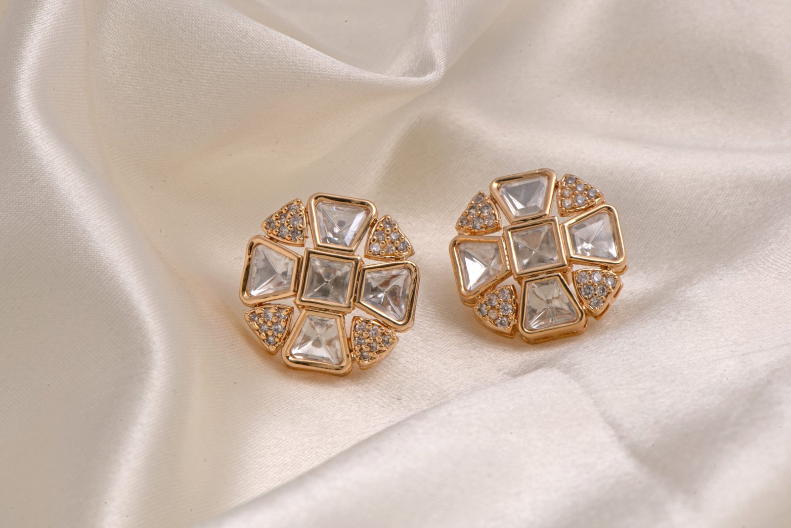 Craftsmanship & Materials: Meticulously made from a high-quality brass-based alloy, these studs are finished with a rich, tarnish-resistant gold polish. The design showcases a central square Kundan stone surrounded by four large triangular crystals and shimmering clusters of micro-stones. Each element is securely handcrafted to ensure durability while maximizing the brilliant light reflection of the unique geometric silhouette.