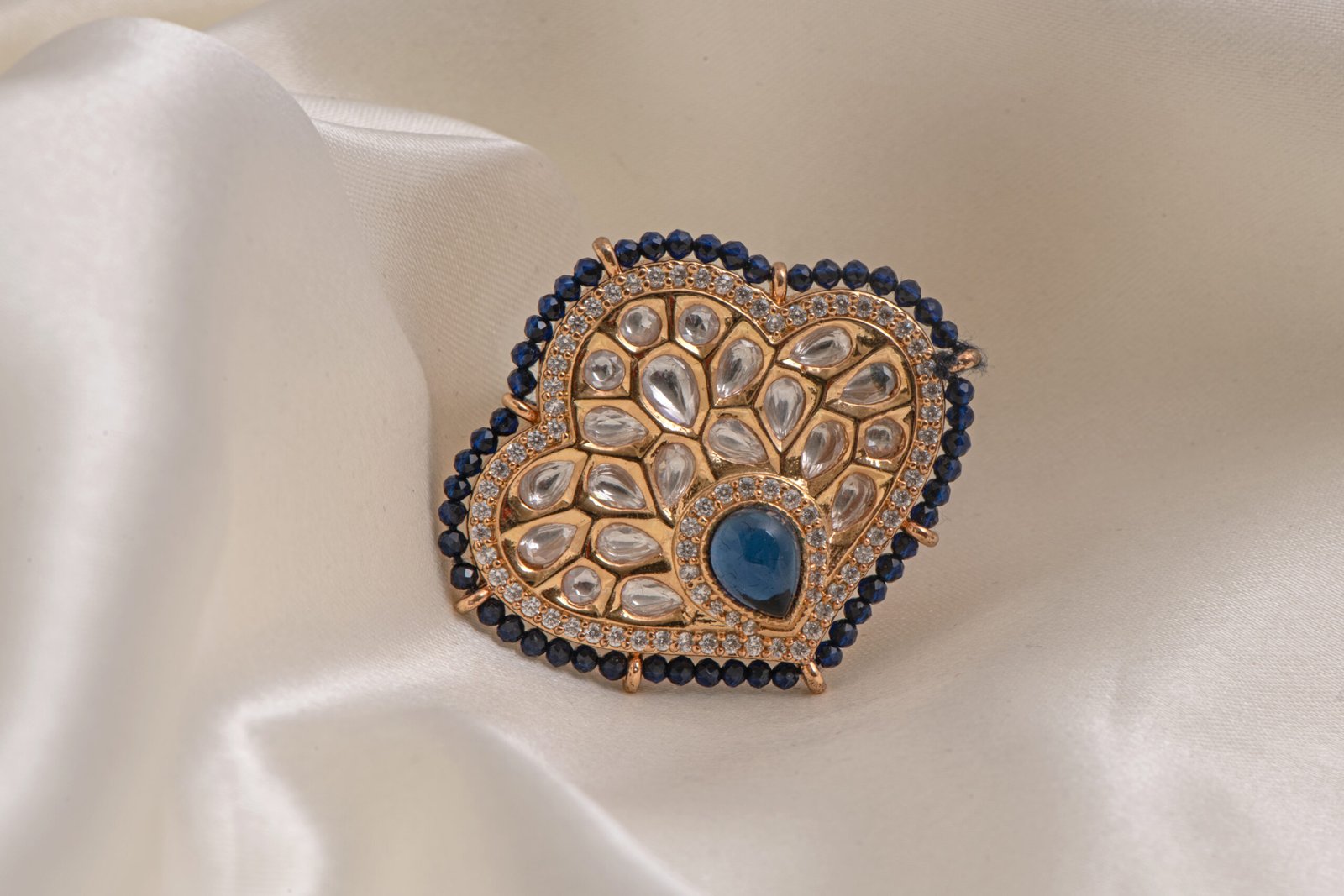 Styling: Style this gold polished blue statement ring with navy or silver silk sarees, heavy bridal lehengas, or sophisticated evening gowns for a royal look. The deep blue contrast against the brilliant white stones and gold base makes this handcrafted ring a versatile piece for high-contrast festive palettes. Its oversized heart silhouette serves as a powerful standalone statement, ideal for making a refined impression at grand celebrations.