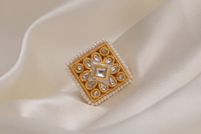 Craftsmanship & Materials: Meticulously made from a high-quality brass-based alloy, this ring is finished with a luxury, tarnish-resistant gold polish. The design showcases a large, precisely handset Kundan stone surrounded by a shimmering border of hand-strung seed pearls. Each element is securely handcrafted to ensure durability while maximizing the brilliant, mirror-like reflection of the traditional Kundan setting.