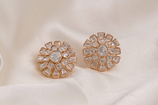 Buy these Gold Polished Real Polki Kundan Studs, featuring a blooming circular design and luxury handcrafted artistry. These stunning gold polished earrings showcase a cluster of uncut-look stones arranged in a regal floral silhouette, perfect for grand weddings. This premium accessory offers a majestic, vintage glow that effortlessly elevates any traditional ethnic ensemble.