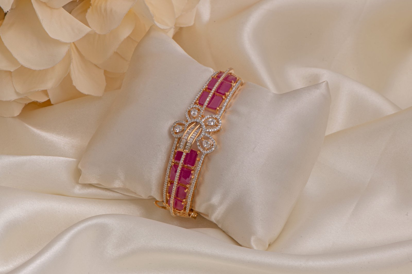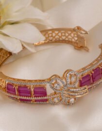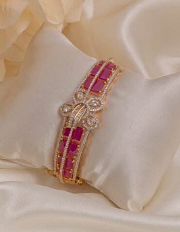 Short Description: The Ruby Regal Gold Polished Bracelet is a stunning fusion of traditional warmth and royal brilliance. Featuring vibrant square-cut rubies and high-grade Cubic Zirconia (American Diamonds), this handcrafted gold polished bracelet is the ultimate luxury accessory for weddings and festive celebrations.