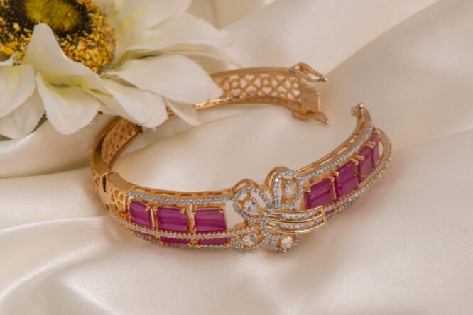 Styling: This versatile gold polished bracelet serves as a regal signature for heavy silk sarees, bridal lehengas, or designer ethnic wear. The deep crimson ruby tones beautifully contrast with the warm golden base and clear Cubic Zirconia, making it a standout focal point. Its bold yet refined silhouette commandingly adds a touch of majestic character to any formal ensemble.