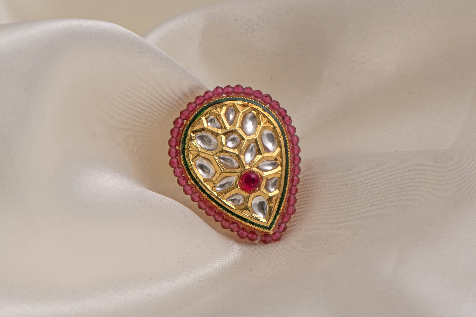 Craftsmanship & Materials: Meticulously made from a high-quality brass-based alloy, this ring is finished with a luxury, tarnish-resistant gold polish. The design showcases a central ruby-red teardrop Kundan stone surrounded by a shimmering halo of precisely handset micro-crystals and gold-rimmed petals. Each element is securely handcrafted to ensure durability while maximizing the deep, brilliant light reflection of the unique Kundan setting.