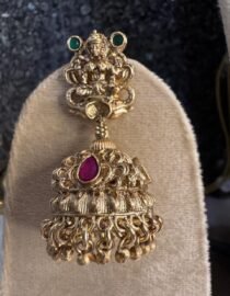Designed in a classic South Indian temple style, this necklace features intricately carved deity motifs along the chain and a proportioned Lakshmi pendant with ruby and green stone accents. Finished with delicate gold bead danglers for graceful movement. Crafted using premium base metal with high-quality gold polish for lasting shine and durability.