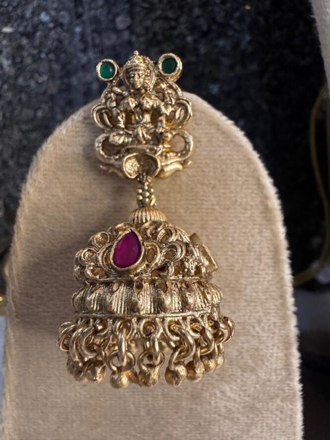 Elegant medium-long temple necklace set crafted on a durable alloy base with rich gold polished finish. Featuring a finely detailed Lakshmi motif pendant accented with ruby and green stones, paired with matching traditional jhumkas for a complete heritage look.