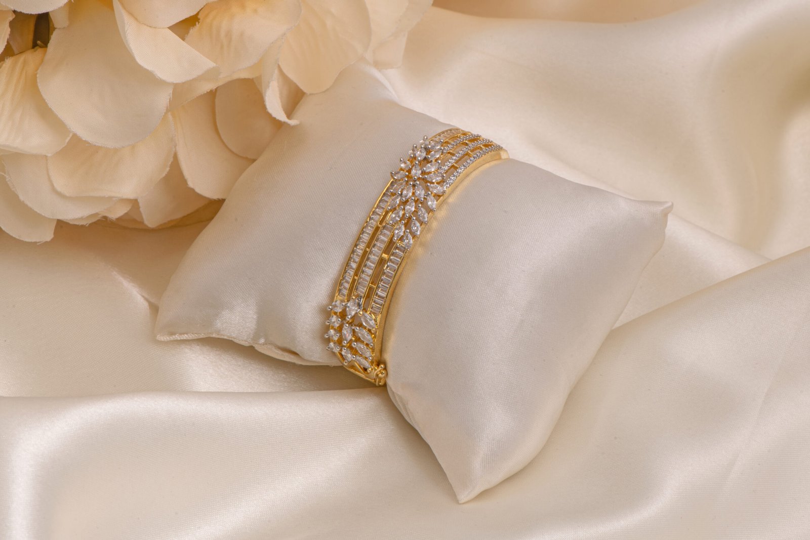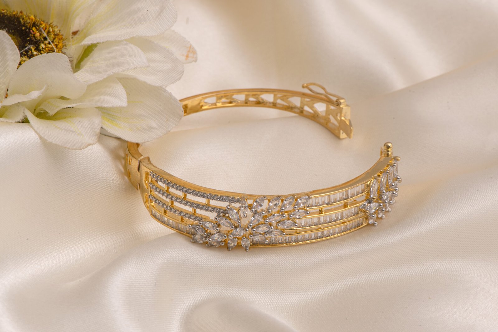 Style this Gold Polished Zircon Kada Bracelet with sarees, lehengas, gowns, or Indo-western outfits. Perfect for weddings, receptions, festive celebrations, and cocktail evenings.
