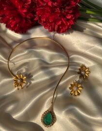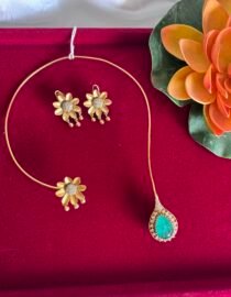 Gold-Toned Floral Green Gemstone Hasli Necklace & Earring Set — A Zevy original handcrafted necklace that blends traditional artistry with contemporary polish. Gold-Toned Floral Green Gemstone Hasli Necklace & Earring Set.