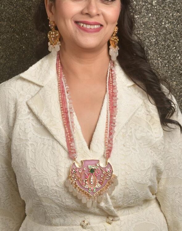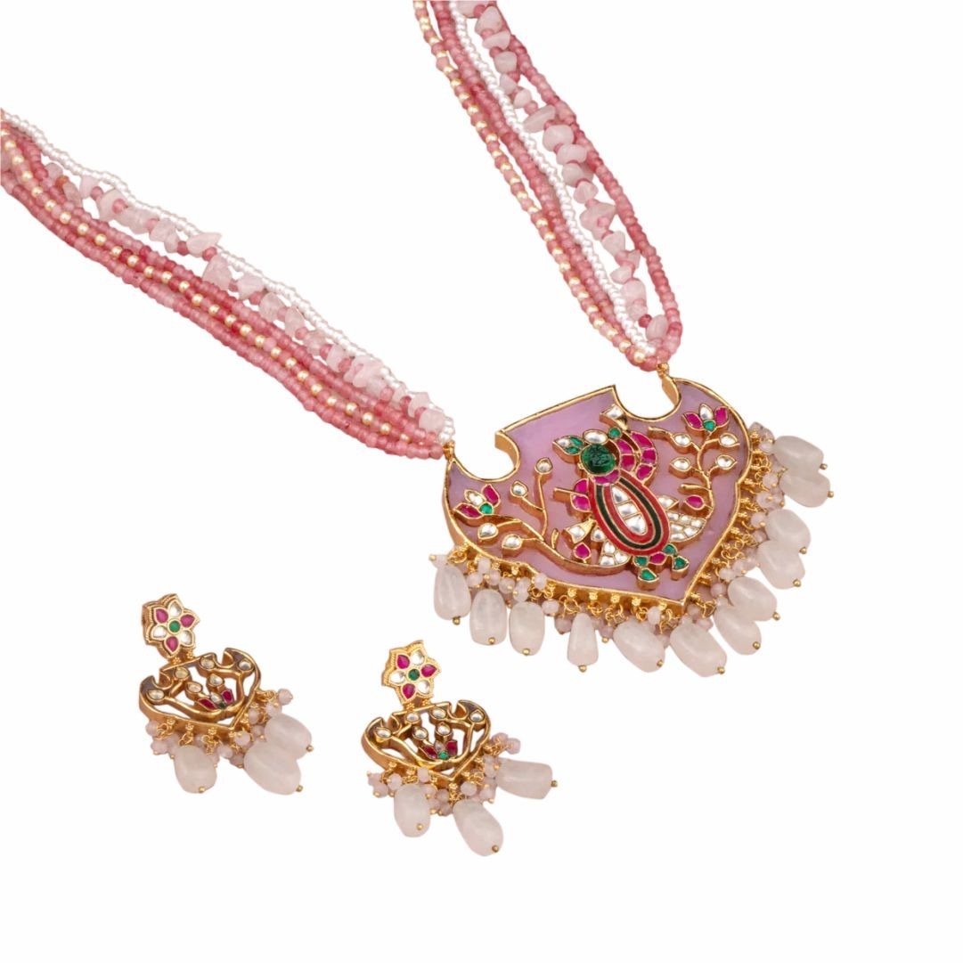 Design & Craftsmanship: Each piece is crafted by skilled artisans using premium base metals and expert plating techniques to ensure long-lasting finish and sheen. Stones are selected for colour, clarity and cut; settings are secured for durability and comfort. Intricate motifs and balanced proportions create a refined silhouette that flatters the neckline.