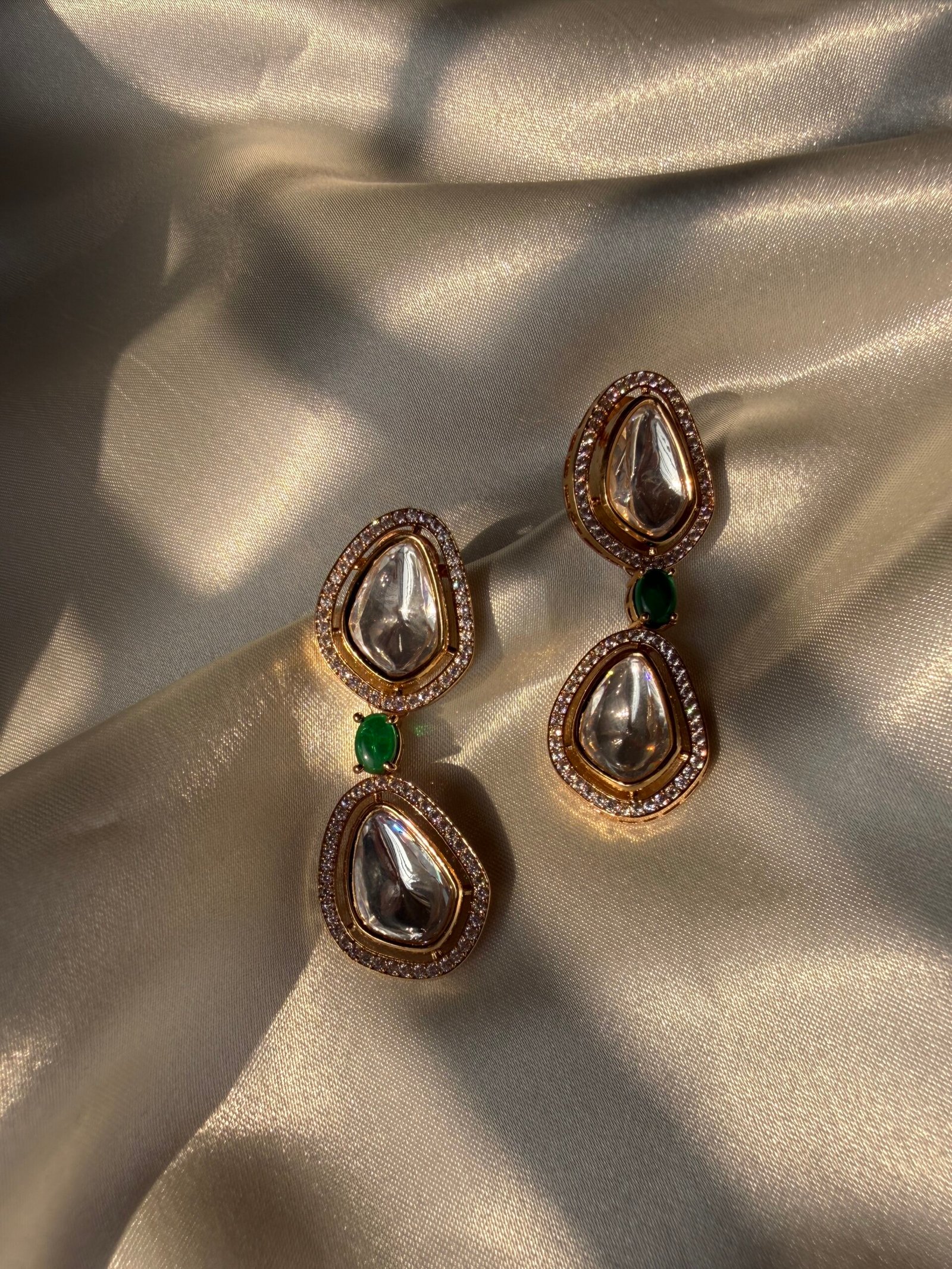 Kundan Necklace and Earring Set with Clear & Green Stones — A Zevy original handcrafted necklace that blends traditional artistry with contemporary polish. Kundan Necklace and Earring Set with Clear & Green Stones.
