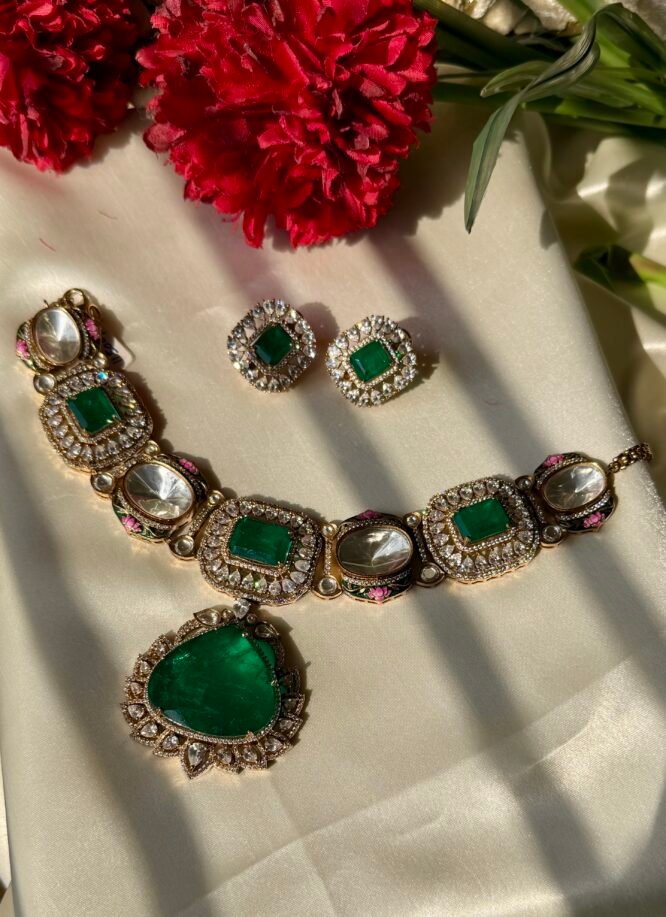 Maharani Emerald Moissanite Choker & Necklace Set with Meenakari — A Zevy original handcrafted necklace that blends traditional artistry with contemporary polish. Maharani Emerald Moissanite Choker & Necklace Set with Meenakari.
