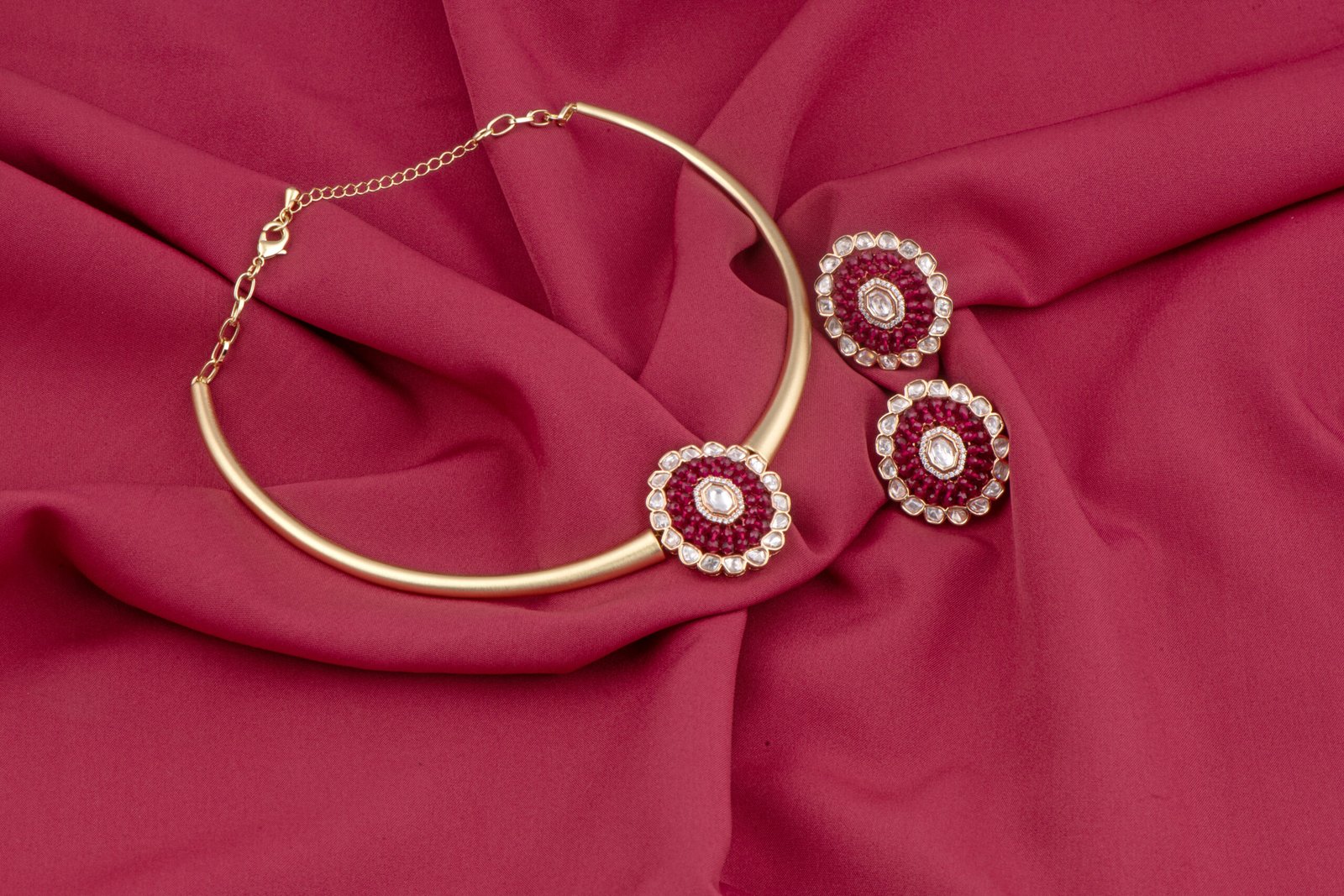 Matte Gold Plated Kundan Ruby Hasli Pendant — A Zevy original, handcrafted with attention to detail and inspired by timeless design aesthetics. 3480 Matte finish gold plated Kundan with Ruby hasli