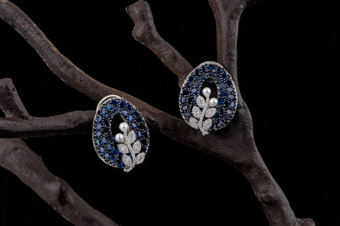 Short Description: An elegant fusion of nature-inspired motifs and royal blue tones. These oval-shaped studs feature a dense mosaic of blue stones accented by a delicate silver-finish leaf branch and shimmering pearls.