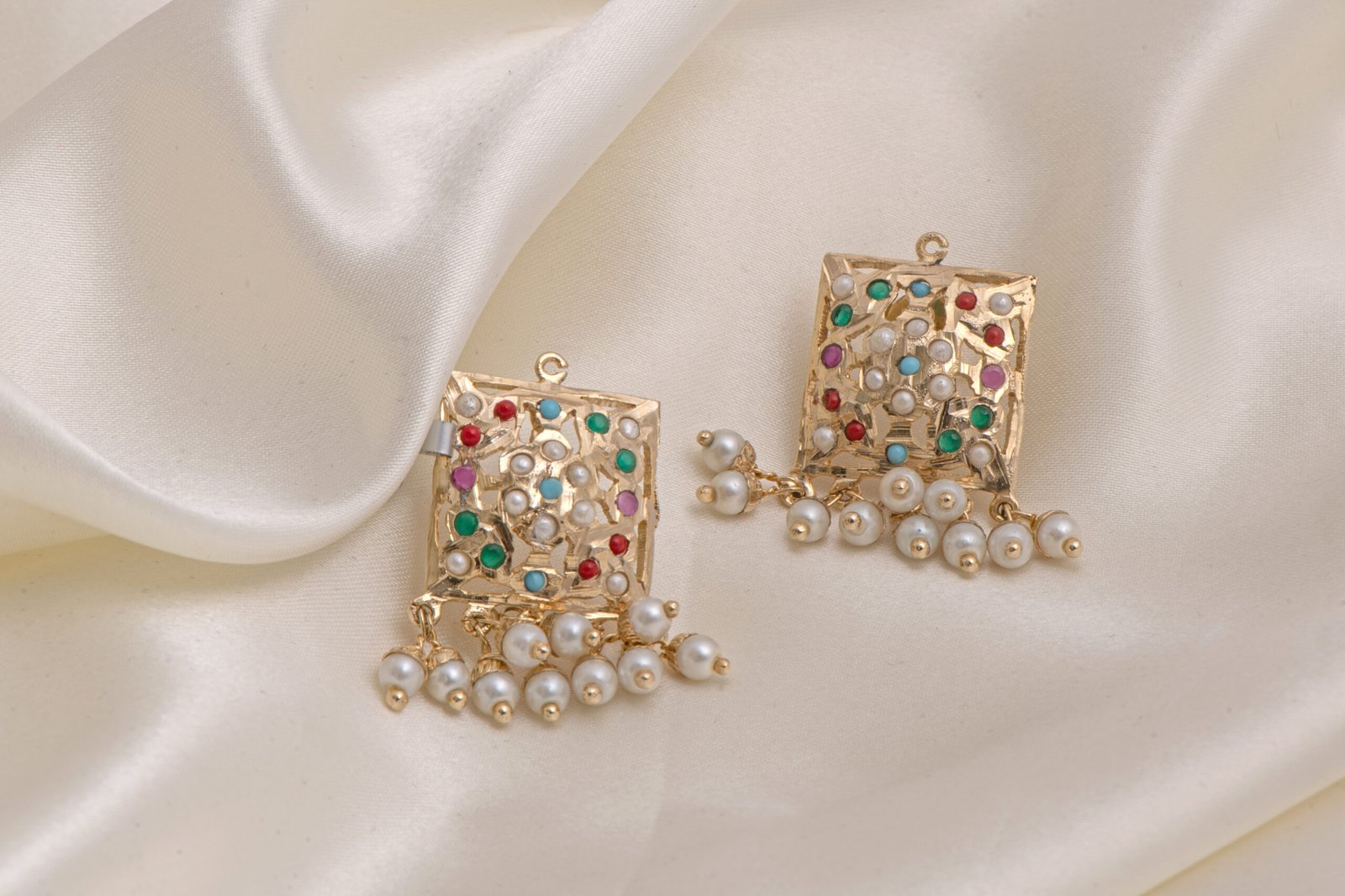 Short Description: Buy these Navratan Jadau Gold Polished Earrings, a royal heritage design featuring traditional handcrafted Jadau settings. These stunning square-drop earrings are adorned with nine sacred gemstones and delicate pearl droplets, making them perfect for bridal trousseaus. This premium accessory offers an antique, majestic glow that elevates grand festive and wedding attire.