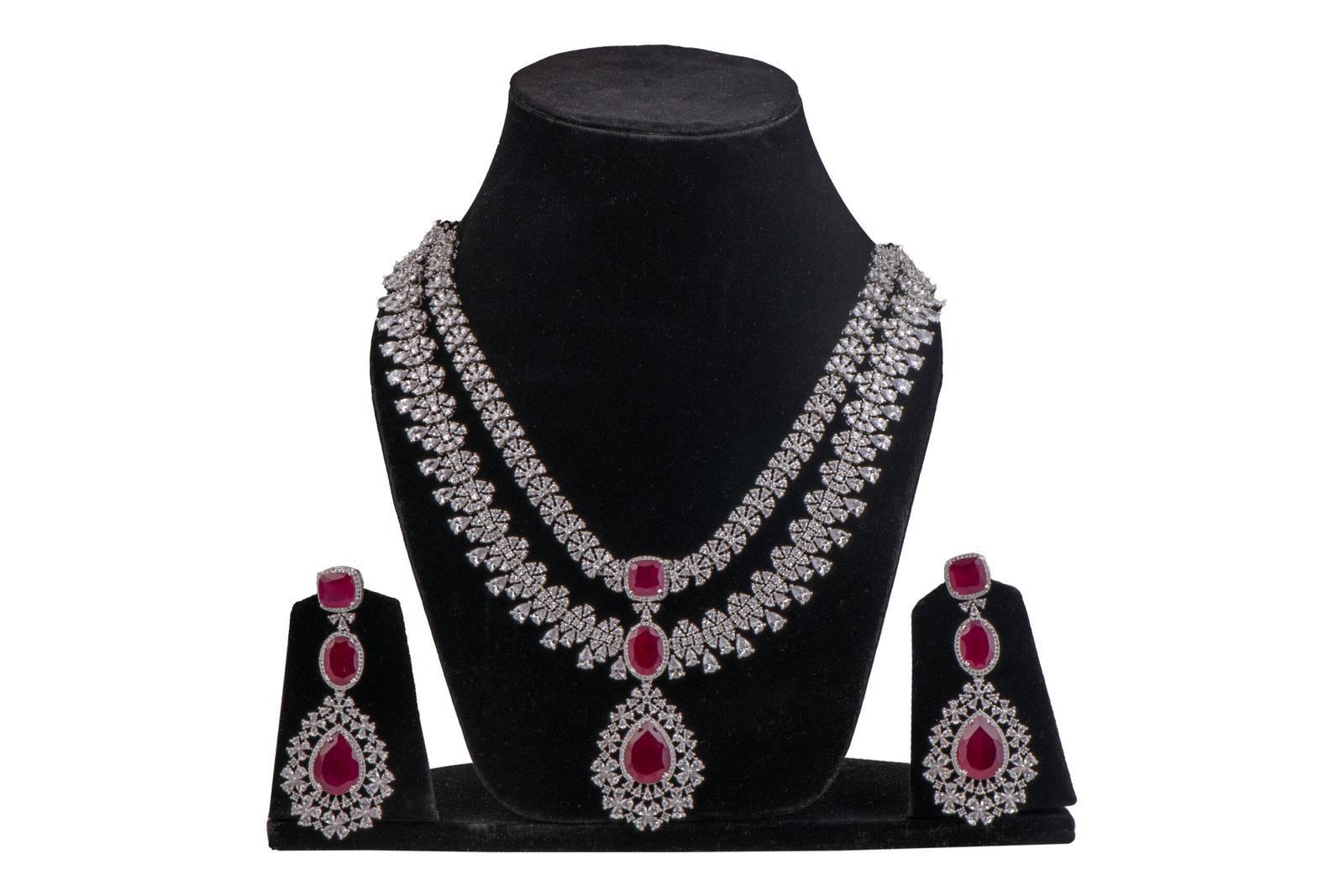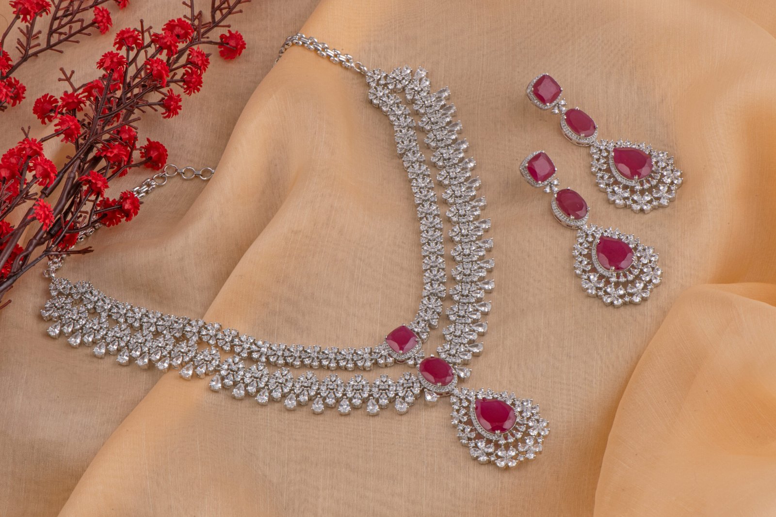 Rhodium polish Ad with Ruby necklace. Handcrafted detail and premium finish.