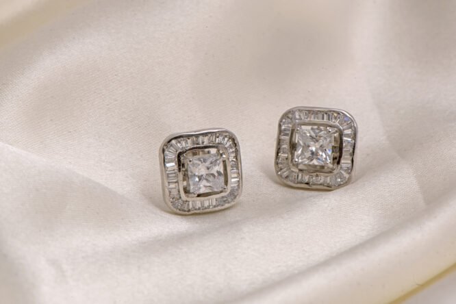 Craftsmanship & Materials: Meticulously made from a high-quality brass-based alloy, these studs are finished with a sleek, tarnish-resistant rhodium polish. The design showcases a magnificent square-cut American Diamond center surrounded by a shimmering halo of baguette-cut stones. Each crystal is securely handset using expert handcrafted jewelry techniques to ensure maximum light reflection and a durable finish.