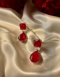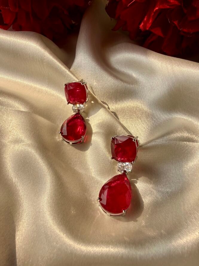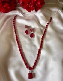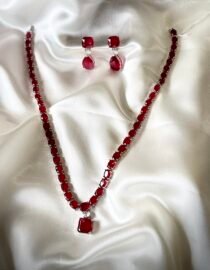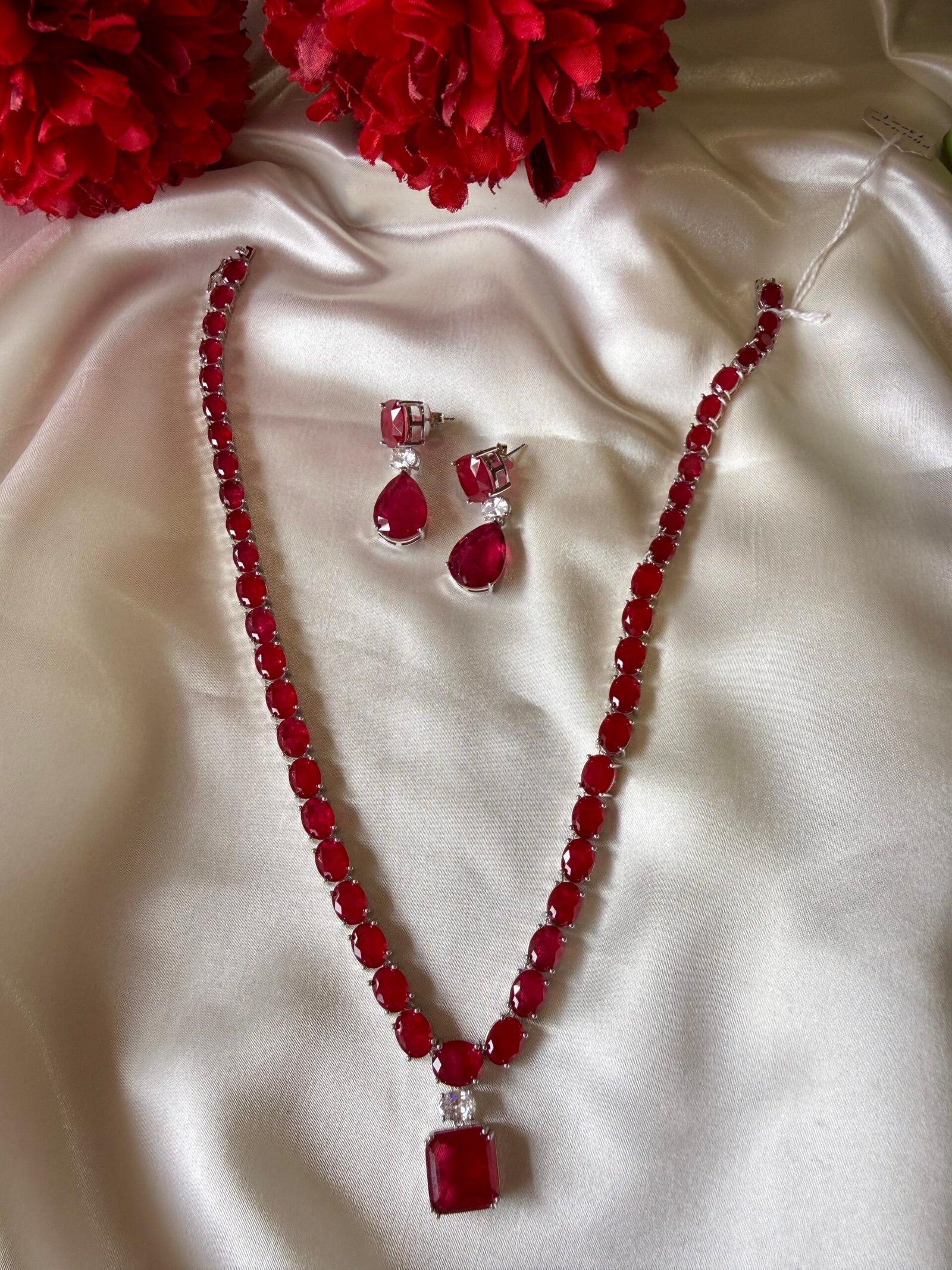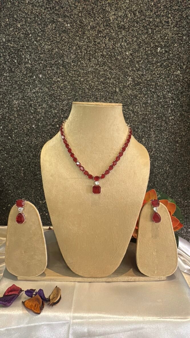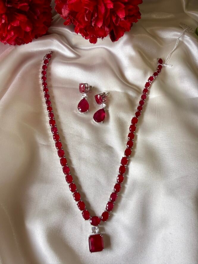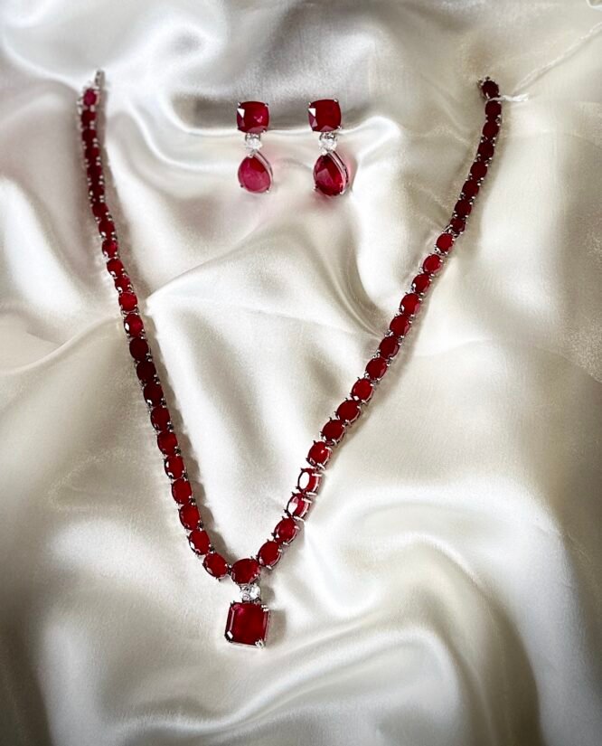Rhodium Polished CZ Ruby One-Liner Neck Piece with Earrings — A Zevy original handcrafted necklace that blends traditional artistry with contemporary polish. Rhodium Polished CZ Ruby One-Liner Neck Piece with Earrings.