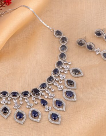 Styling: This high-impact ruby rhodium necklace set serves as the perfect signature for silver-work lehengas, silk sarees, or sophisticated evening gowns. The brilliant contrast between the rich red stones and the clear Cubic Zirconia adds a layer of timeless opulence to any ensemble. Its structured yet fluid design ensures it stands out as a powerful focal point for your most special moments.