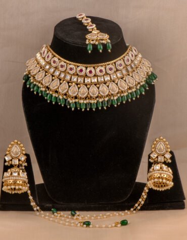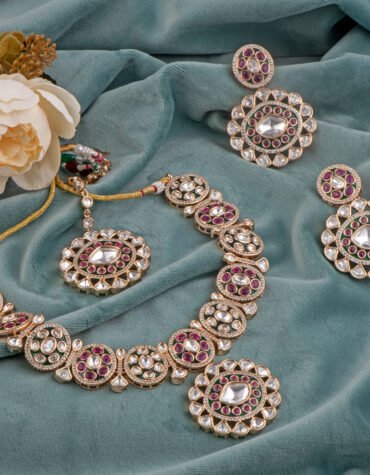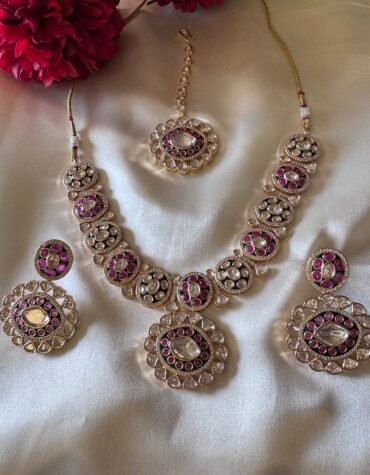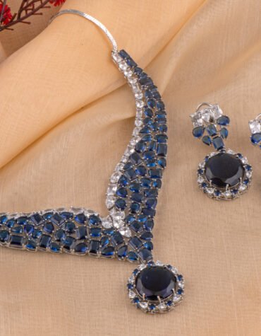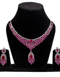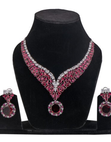 Short Description: The Rhodium Polished Imperial Ruby Necklace Set is a breathtaking display of royal elegance and contemporary sparkle. Featuring deep crimson stones and high-grade Cubic Zirconia (American Diamonds), this handcrafted rhodium polished set is the ultimate choice for bridal wear and grand celebrations.