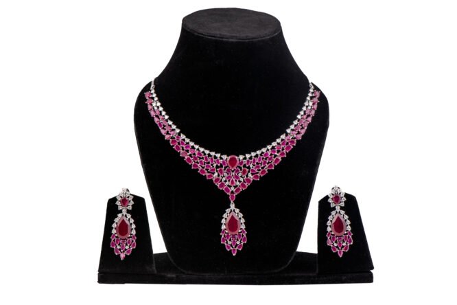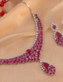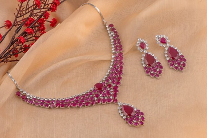 Craftsmanship & Design: Expertly finished with a premium rhodium polish, this necklace features a cascading V-shaped silhouette for a majestic drape. The design is meticulously handset with vibrant pear-cut rubies and a shimmering halo of round brilliant-cut American Diamonds. Matching drop earrings echo the necklace’s floral-inspired motifs, creating a seamless and high-fashion aesthetic.