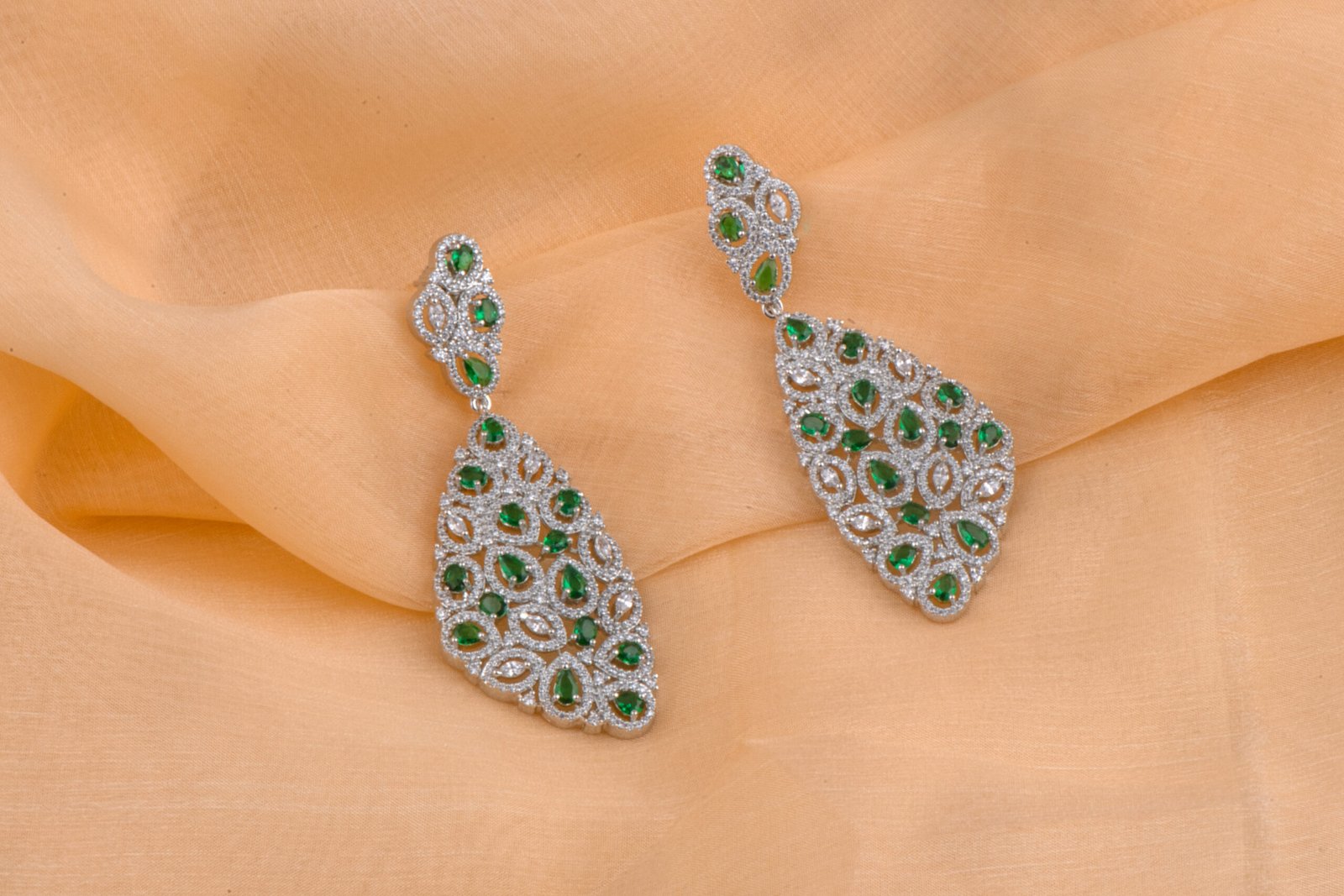 Short Description: A masterpiece of intricate design, these teardrop-shaped earrings feature a delicate silver-finish lattice adorned with vibrant emerald-green stones. Exuding a refined, vintage-inspired elegance, they are designed to add a touch of royal brilliance to any formal ensemble.