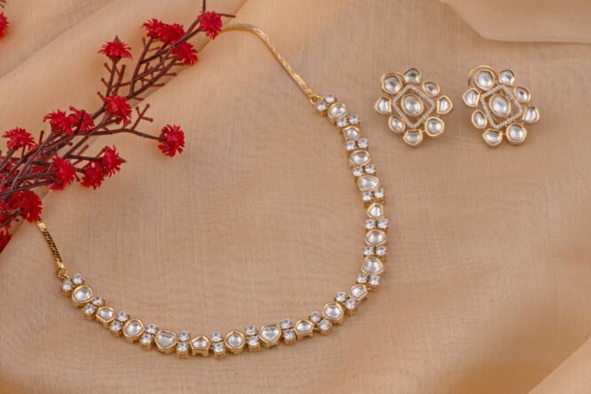 Uncut Polki gold plated necklace from Zevy is a finely crafted necklace that blends traditional aesthetics with modern wearability. Made using premium materials and meticulous workmanship, this piece adds instant elegance to sarees, lehengas, and Indo-western outfits. The design highlights include intricately set stones, secure clasps, and a comfortable weight profile so you can wear it through celebrations.